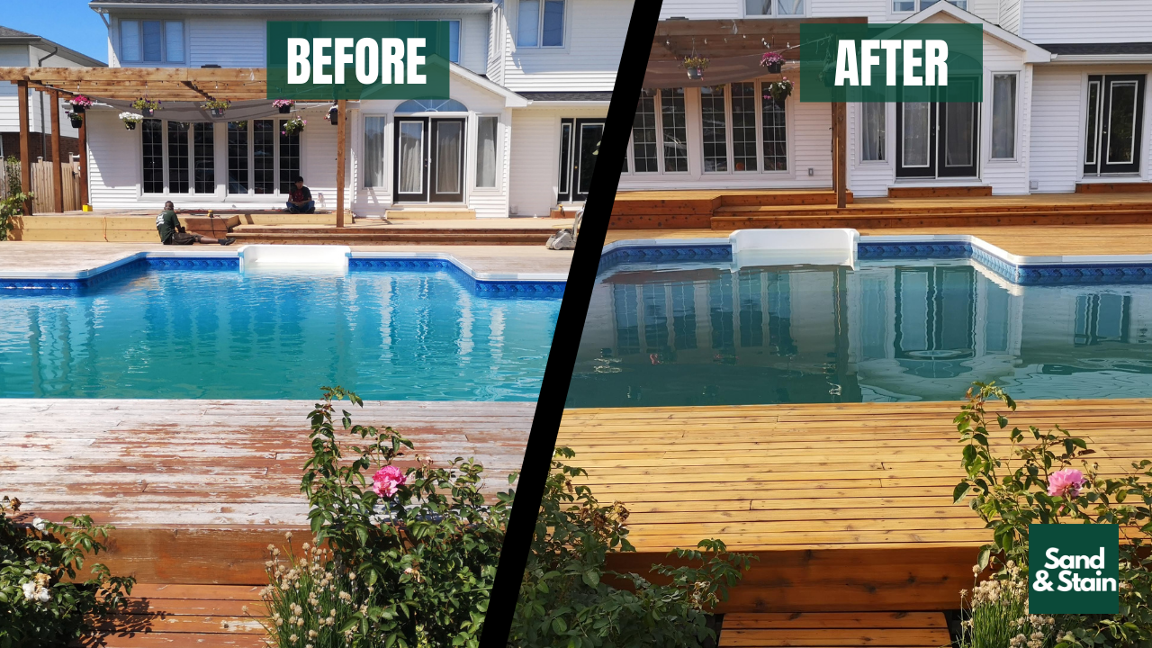 Here’s a detailed look at the Before & After, as well as the During. This hard sand restoration is the most important step to get your wood finish & protection off the right start and never peels. Just look at the value sanding yields after removing all previous stains and sealers and removing all sun-faded gray wood. This is the Sand & Stain System, and we guarantee your wood project will never peel.