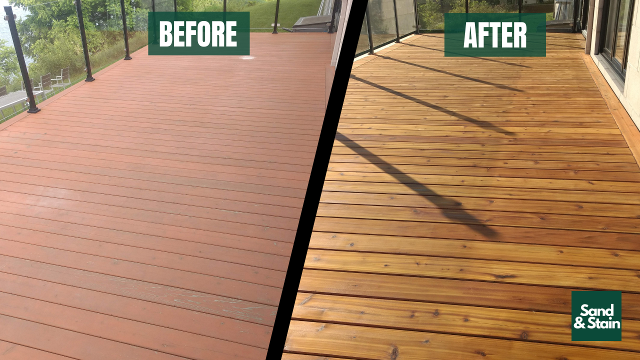 See the difference our hard sanding restoration makes on this western red cedar deck. An application of true penetrating oil stain absorbs and seals the wood while allowing breathability. All part of guarantee that your deck will Never Peel Again.